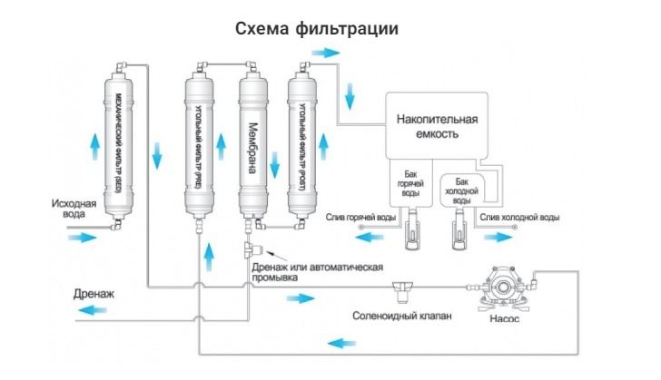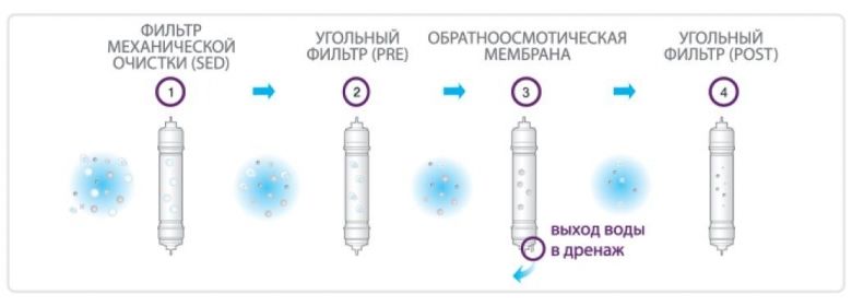 4-х стадийная бытовая система очистки воды на основе обратного осмоса.
